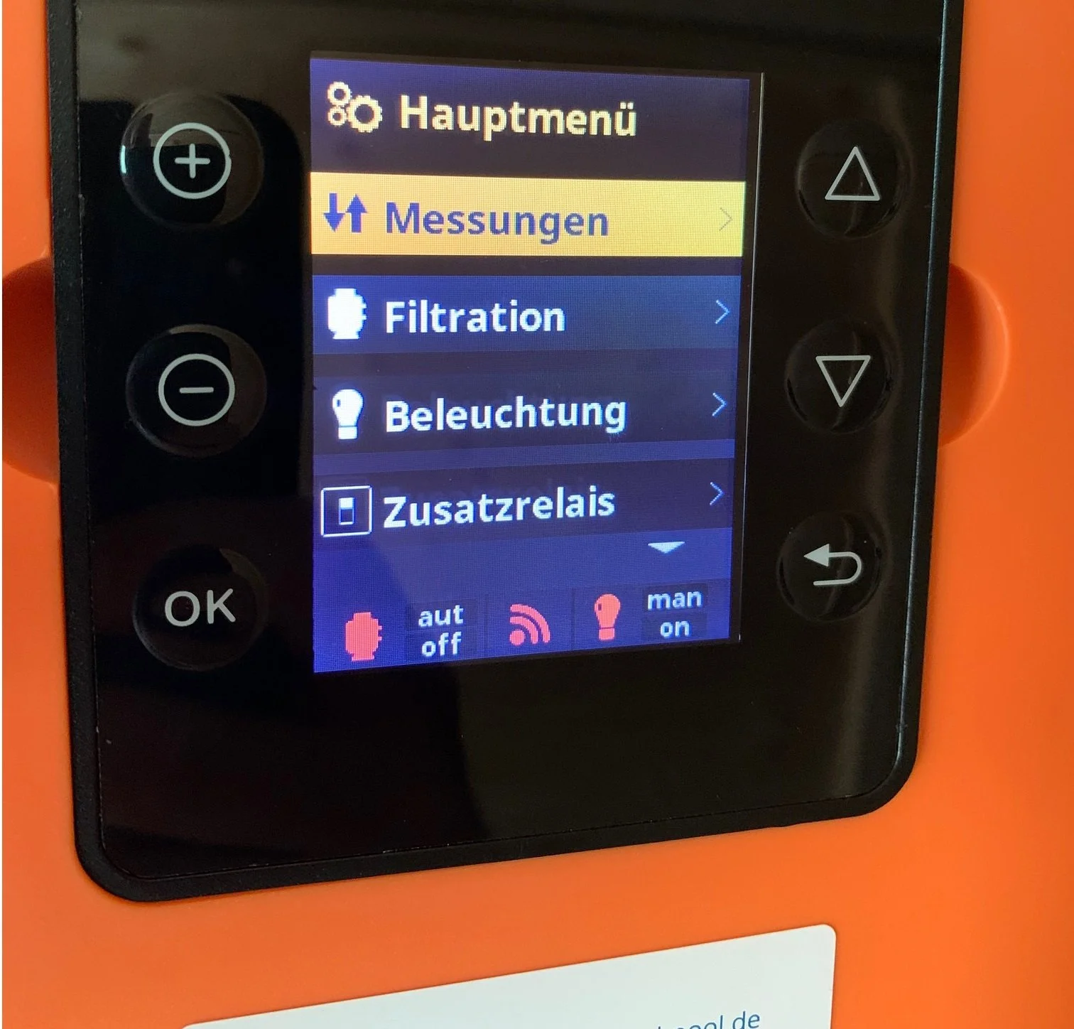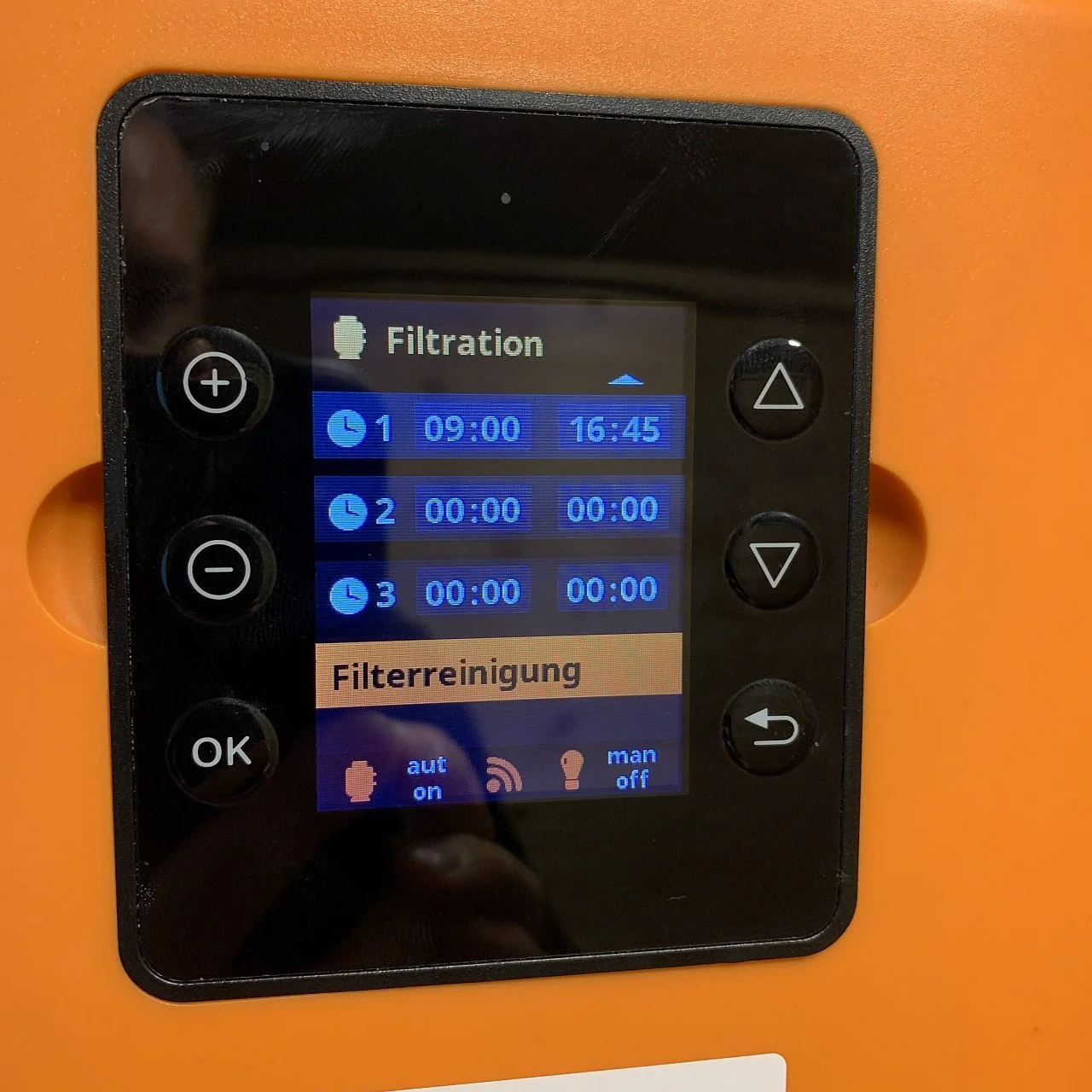 11. Wahlhebel wieder auf Filtern einstellen, und das Menu mit der zurück-Taste verlassen, die Pumpe startet wieder automatisch
