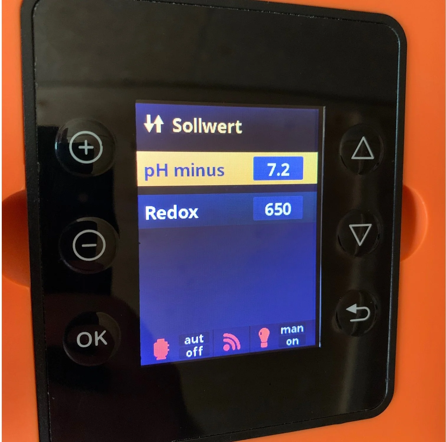 Was ist zu tun? Da unser Chlorwert über dem gewünschten Wert von maximal 0,8 mg/L liegt müssen wir den Sollwert in der Dosieranlage etwas reduzieren.